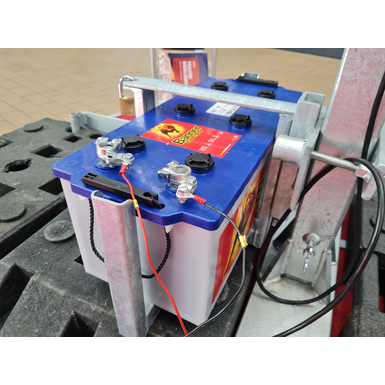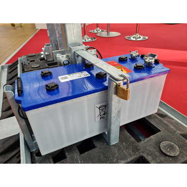 Nosilec baterije, jeklen, vroče pocinkan, za 1x baterijo do 180Ah, za pritrditev na varnostno ograjo proti kraji!
