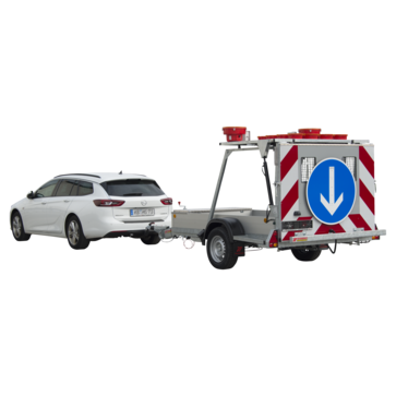 Mobilna varnostna prikolica FA 2 z veliko nakladalno površino in nakladalno rampo za uporabo na cestah z dvosmernim prometom. V skladu s prometnimi znaki TL z VZ 616 v manjši izvedbi, v LED-tehnologiji osvetljen sistem puščic, vključno s kabelskim daljinskim upravljalnikom s funkcijo nadzora in elektromotorno nastavljivim VZ 222