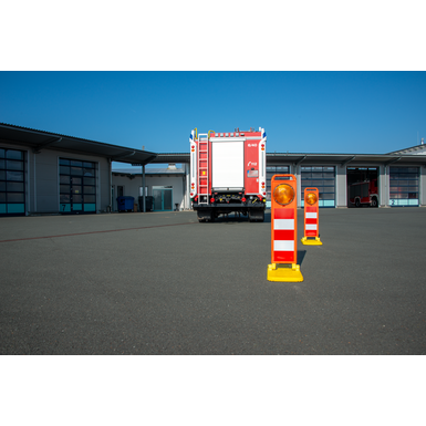 Ti zložljivi svetilniki niso opisani v RSA, temveč le prometni stožec (750) in utripajoči svetilnik. Vendar pa ti na splošno NIMAJO fiksne povezave in lahko zato v določenih okoliščinah prav tako predstavljajo nevarnost za udeležence v prometu/delavce. To ne velja za ta zložljivi svetilnik, ki se ob dotiku običajno preprosto zloži in nobena luč ne more "odleteti". Odsevne vrednosti (folija tipa RA2) so 98 % vrednosti prometnega stožca.