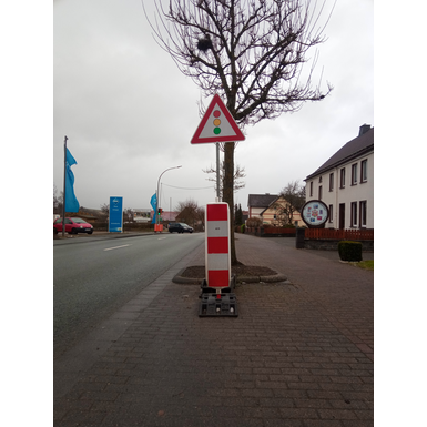 Ta "novi" prometni znak je namenjen zlasti kot varnostni element na območju pločnika. V nasprotju s tem se vodilni znaki NE smejo uporabljati na območju pločnika ( glej splošni oddelek A3.4.3(4) RSA21). !